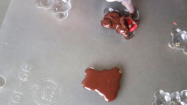 チューブから絞り出すと、後ろ側がデコボコして綺麗じゃないけど... チョコが固まらないうちに型を机にトントン落とす(ぶつける)と、後ろの凸凹が平らになるので...