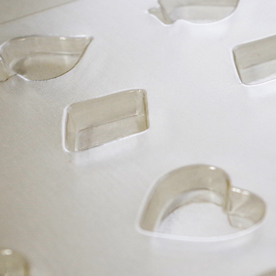 | 素材 | ポリエチレン(耐熱温度65度)下敷きのような素材なのでカタチによって真っ平らにはならず、机でカタカタいう場合がありますが、凹みに入れたチョコが流れ出ませんので良品となります。 |