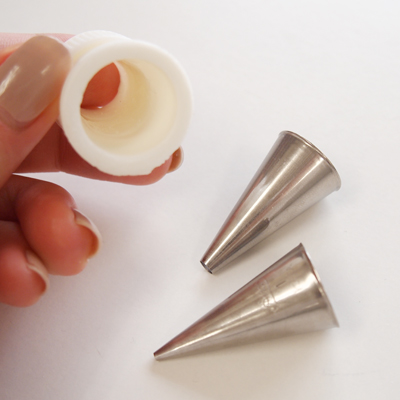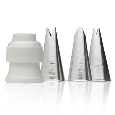葉っぱが3種類(#67, 349, 352)に、Ateco社の取り替えキャップが1つついているので、これさえあれば好きな口金を取り替えながらご使用頂けます