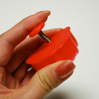 後ろ側のパーツを押すと、スタンプ部分が生地に近づき絵柄をつけられます。バネになってるので、クッキーの厚みは気にせずOK!