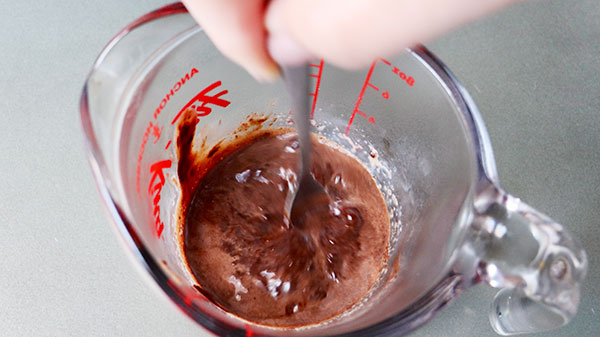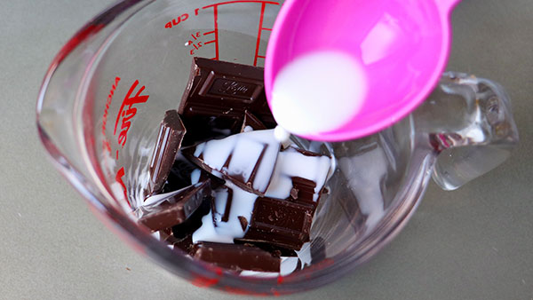 板チョコを耐熱器に割り入れ、牛乳大さじ1杯をチョコの上からドバッと回しかけ、600Wで50秒、電子レンジで溶かしたら...