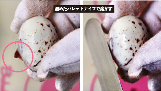 もし、卵のフチにバリのようなものが出来てしまったら、パレットナイフを温めて、その熱で溶かして整えちゃえます。