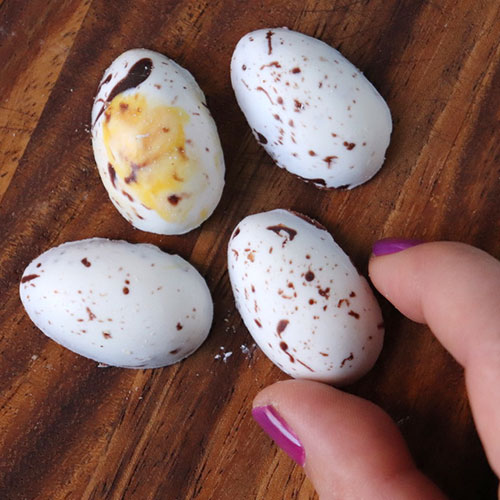 凹みの中にチョコがテンテンっと飛び散ってればOK。あまりやりすぎると汚れすぎてしまうのでほどほどに...