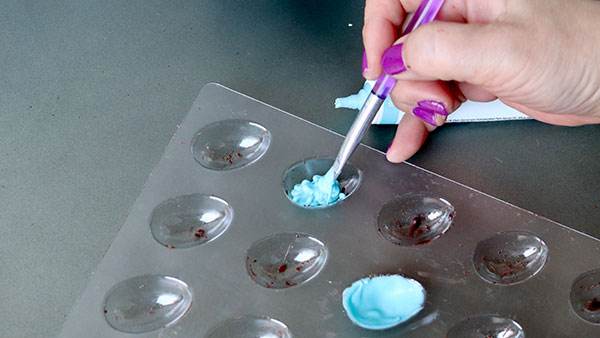 手を使って刷毛をしごいて、チョコ型の凹みに飛び散らかします。