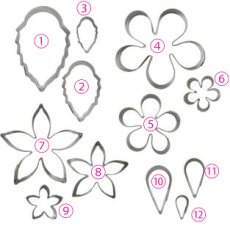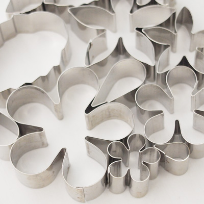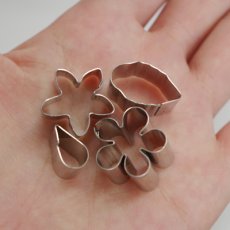 Ateco社、お花&葉っぱのちっちゃなクッキー型セット。花が2種類に、葉っぱ、ドロップ(水滴型)の4種はそれぞれ、3種類のサイズ違いがセットになっているので、合計12個のセットになります。