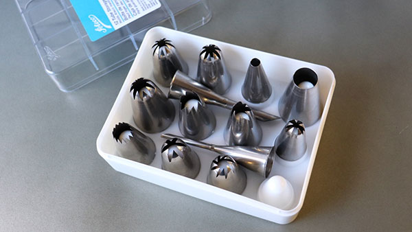 3列×4列の升目状に計12個収納できるケースで、口金を固定する突起もでていてガタガタとせず、ケーキデコレーションに使用する大きめな口金をセットして収納できます。