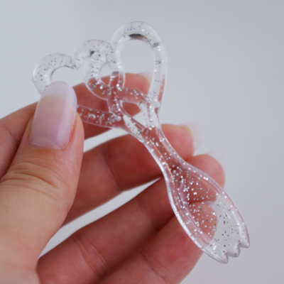 透明で中にラメのはいったピックで2つのハートが重なっているデザインになっています。清楚感があってウエディングパーティーにおすすめ!