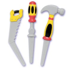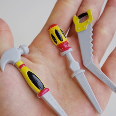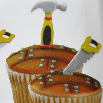 ペンチ、トンカチ、ノコギリの3種類です。カップケーキのセンターにぐさりっ、と刺す定番なスタイル以外に、ケーキデコレーションのワンポイントでコチョッとまとめてさしたりするのも面白くないですか? 黄色の使い方が斬新すぎてぐっときませんが、、、使い方のアイデアとしては面白いですよねッ♪