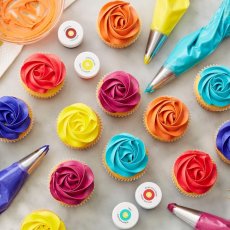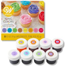 Wilton社のアイシングカラー、ジェルタイプの8色セット。ボトルの容器から楊枝で取り出し、クリームに混ぜてお使いいただきます