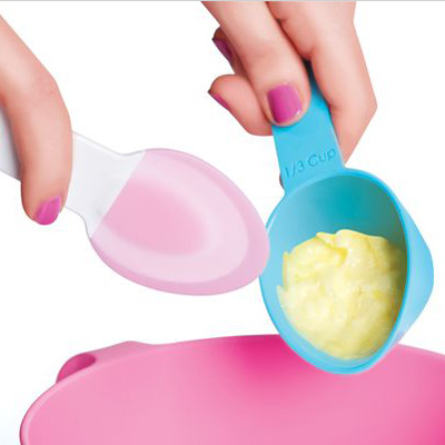 持ち手の所にCUP,mlの表記がしてあるので海外の1/3cupなどを日本の量に変えたりする手間がかからないし、元気なカラフルカラーは作業を楽しくしてくれると思います♪