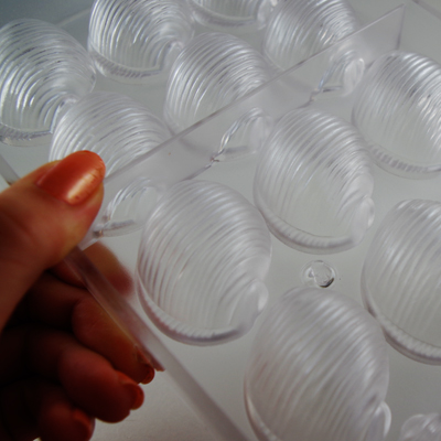 小さなパーツにチョコを絞り出して固めるだけだったり、キャンディコートのように筆で側面に塗り付ける場合は不要ですが、テンパリングしたチョコレートを型に流し込んだ後、中身を一旦取り出してガナッシュを詰める作業のボンボンには、半透明で固い素材の、このチョコレート型がおすすめです。