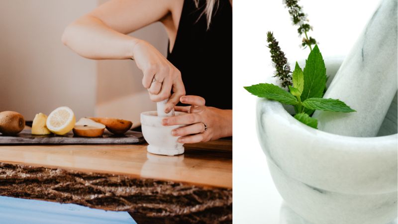 クロック(器)にハーブやスパイスなどの食材を入れ、サーク(石の棒)で叩き潰し、食材の香りを引き出せます