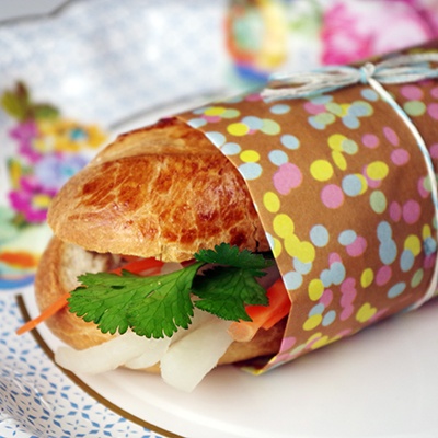 トーキングテーブルが提案するように、四角くカットしたケーキとか、バゲットサンドなどを帯状にラップしてもシンプルな柄と、落ち着いたカラーリングが使いやすいです