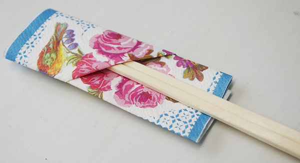 紙ナプキンはコップに何枚か入れてテーブルにセッティングするのもいいですが、日本でしたら、お箸袋のようなスタイルに折りたたんで使っても喜ばれると思います。差し入れのお弁当に添えたら素敵じゃないですか?