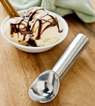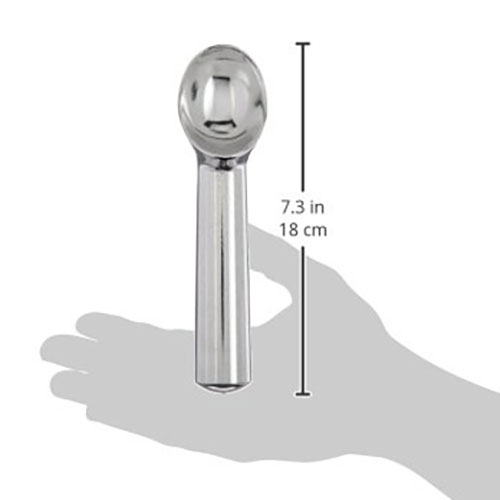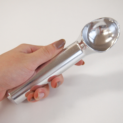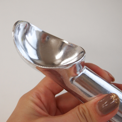 アルミ製で、持ち手部分に熱伝導材が注入されているので、握った熱が伝わり、固いアイスもスムーズに取り出せます。 使用する前に数分ぬるま湯に浸してから使用して下さい(絶対に沸騰はNG)