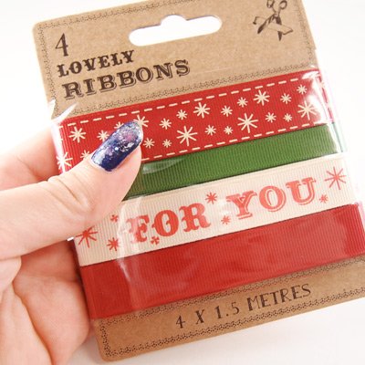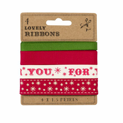 太めで濃いレッド、FOR YOUのメッセージ入りリボン、細めなグリーンリボン、レトロなキラキライラストがプリントされたリボンの4種類がセットになっています。