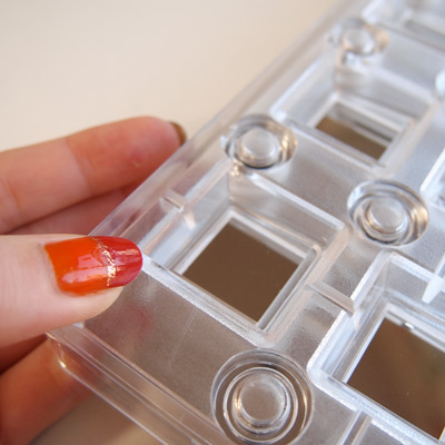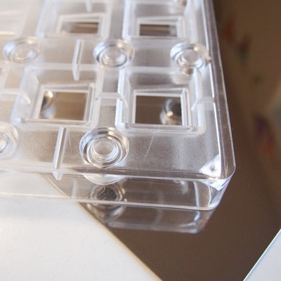 小さなパーツにチョコを絞り出して固めるだけだったり、キャンディコートのように筆で側面に塗り付ける場合は不要ですが、テンパリングしたチョコレートを型に流し込んだ後、中身を一旦取り出してガナッシュを詰める作業のボンボンには、半透明で固いポリカーボネイト製のチョコレート型がおすすめです。