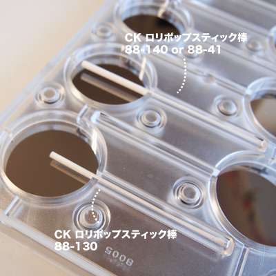 棒はチョコレート型にピッタリなロリポップスティック棒【88-130】(11.4cm)、ミニサイズのロリポップスティック棒【88-130】がはまります。