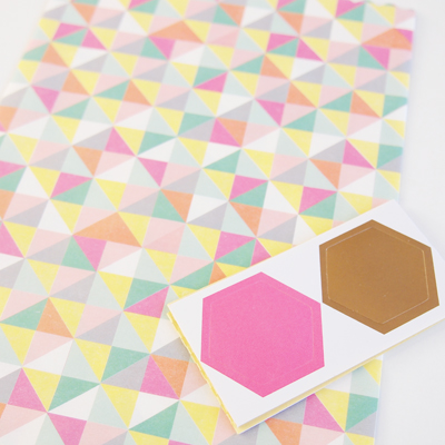デザインはカラフルな幾何学模様がプリントされています。同ステッカーは幾何学模様にあいそうな六角形でゴールドとホットピンクがセットです。