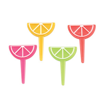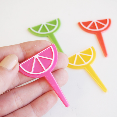 ビタミンカラー(イエロー、レッド、ピンク、ライムグリーン)のカットオレンジのピックです。