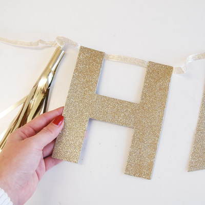ゴールドグリッターのグリッターのペーパー文字がリボンで繋がっています。両サイドにはゴールドタッセルが着いています。