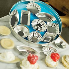 ベーシックな形がそろっていますので、ちょっとづつのせるものを変えて楽しい前菜(または小さなデザート)を作ってみたくなるタルト型でしょ?