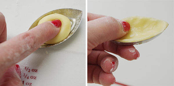 凹みを作って焼いたあとは、クリームをしぼって、キレイな色のカットフルーツをのせたり、チョコを凹みに埋たり... といってもコレ、とってもとっても小さい型なのでアレコレは無理かも。