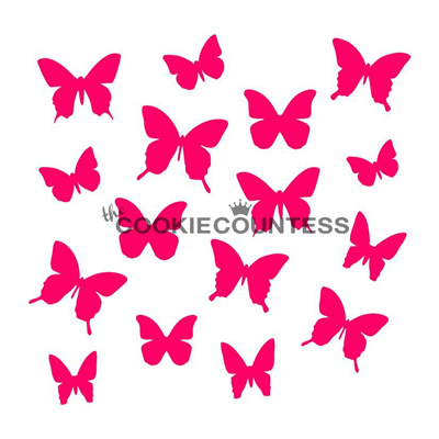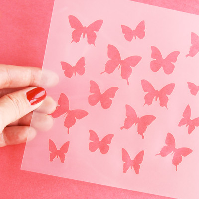 5.5インチ正方形のステンシルで、蝶が飛んでるような柄です。アイコンとしてひとつをステンシルしてもいいし、チョウの柄として使用しても良いと思いますよ♪