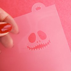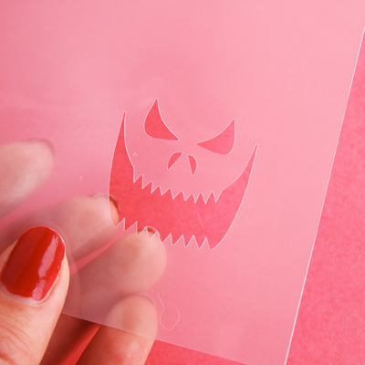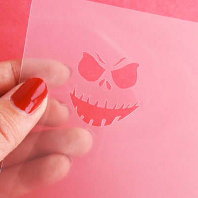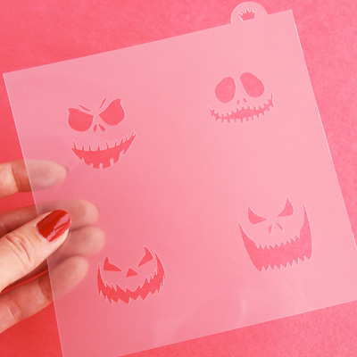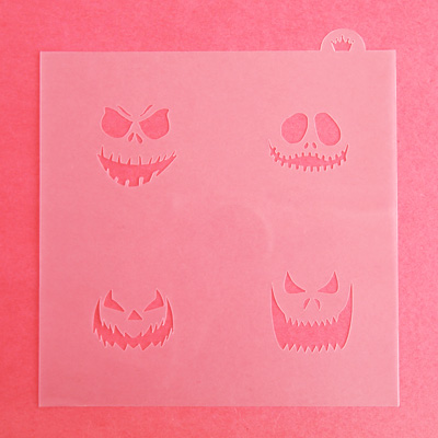 5.5インチ正方形のステンシルで、ハロウィンのパンプキンかぼちゃ(ジャックオーランタン)の顔の柄です。